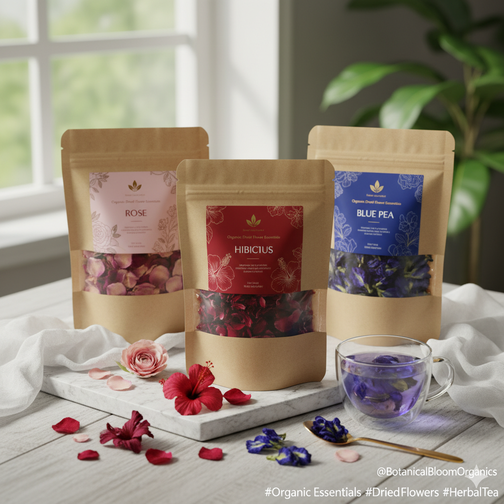 Organic Essentials Dried Flower Teas — sip the power of pure rose, hibiscus, and blue pea for a naturally refreshing glow.